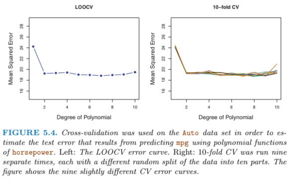 그러나 validation set approach의 단점은 data set이 어떻게 split 되었냐에 따라서 error의 추정치도 심하게 변한다는 것이다. overestimate(과대추정) 되는 단점도 있다(training dataset이 적어서).