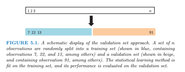 Validation set Approach 는 test error를 추정하기 위한 가장 간단한 방법으로 training data set을 random하게 섞은 후 split 하여 training set과 test set으로 나누는 방법이다 (반반에 가깝게 50:50).