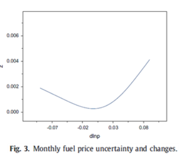 - 유가 불확실성은 유가의 증감과 관련됨. 그림 3은 유가 변화에 대한 유가 불확실성을 나타냄. 이에 따르면 유가(연료가격)가 상승할 때 유가 변동성이 더 큼을 알 수 있음. 이는 운전자가 유가가 상승할 때 유가가 곧 변화할 것이라는 것을 더 쉽게 알 수 있음을 뜻함